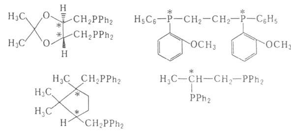 В кач-ве хиральных лигандов L* применяют дифосфины, для синтеза к-рых используют (+)-винную к-ту, L-гидроксипролин и др., напр.: