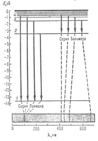 Рис. 1. Схема уровней энергии атома водорода (горизонтальные линии) и оптич. переходов (вертикальные линии). Внизу изображена часть атомного спектра испускания водорода - две серии спектральных линий; пунктиром показано соответствие линий и переходов электрона.