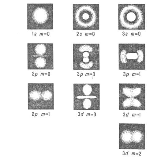 определяет для электронного облака в атоме среднее распределение электронной плотности. Разл. квантовые состояния атома водорода существенно отличаются друг от друга распределением электронной плотности (рис. 2). Так, при l = 0 (s-состояния) электронная плотность отлична от нуля в центре атома и не зависит от направления (т.е. сферически симметрична), для остальных состояний она равна нулю в центре атома и зависит от направления.