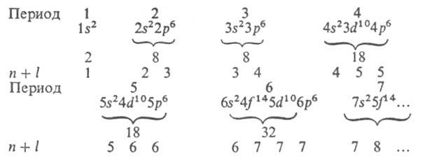 Для каждого периода указаны электронная конфигурация благородного газа, макс. число электронов, а в последней строке приведены значения п + l. Имеются, однако, отступления от этого порядка заполнения (подробнее о заполнении оболочек см. Периодическая система химических элементов).