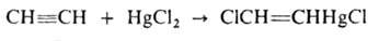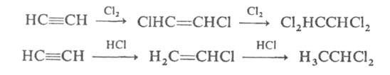 Для ацетилена характерны р-ции присоединения, к-рые происходят в две стадии: сначала образуются замещенные этилена, затем - замещенные алканов. Галогены присоединяются непосредственно, галогеноводороды - в присут. катализаторов (напр., CuCl, HgCl2):