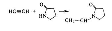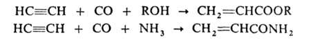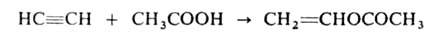 Спирты присоединяются к ацетилену в присут. КОН, BF3 или HgO при 150-200°С Продукты р-ции - простые виниловые эфиры, используемые в произ-ве полимеров, смазочных масел, эмульгаторов и др. Аналогично к ацетилену могут присоединяться карбоновые к-ты (кат. - HgSO4, ацетаты Zn или Cd на активиров. угле), амины, амиды к-т, тиолы и др. с образованием виниловых соед., напр.: