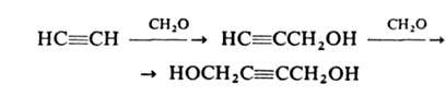 Ацетилен легко присоединяет альдегиды и кетоны в присутствии щелочных катализаторов (реакция Фаворского). Большое практическое значение имеет реакция ацетилена с формальдегидом в присутствии ацетиленида Си (реакция Реппе):