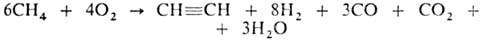 Метан пропускают между металлич. электродами при нормальном давлении, т-ре 1600°С, времени контакта доли секунды; смесь образовавшихся газов резко охлаждают водой. Полученный газ содержит 12-15% по объему ацетилена (теоретически возможно 25%), к-рый выделяют р-рением в воде под давлением. Из 1000 м3 прир. газа получают 300 кг ацетилена, 26 кг этилена, 21 кг сажи и 1170 м3 Н2. Расход электроэнергии ок. 9 кВт-ч на 1 кг неочищенного ацетилена. 3. Термоокислит. крекинг (частичное окисление) прир. газа благодаря теплу, выделяющемуся при частичном сгорании метана (СН4:О2 = 1 :0,65):