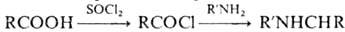 Наиб. распространенные ацилирующие агенты - хлорангидриды карбоновых к-т. Они легко ацилируют амины и их соли. Процесс проводят в воде, инертных р-рителях, пиридине (метод Айнхорна). В последнем случае хлорангидрид не добавляется к реакц. смеси, а получается непосредственно в ходе р-ции из карбоновой к-ты и тионилхлорида: