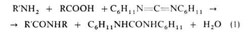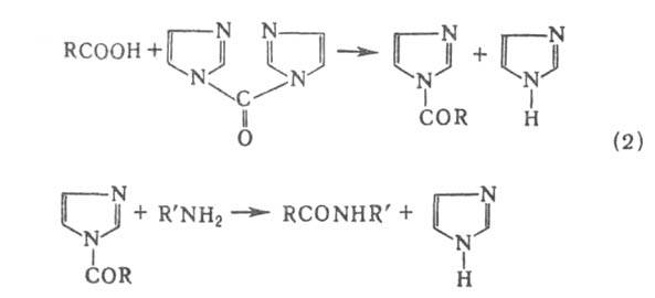 RCONR'2. В случае ароматич. аминов р-ция ускоряется в присут. А1С13, РС13, H2SO4. К-ты ацилируют амины практически количественно в присут. карбодиимидов, напр. N,N'-дициклогексилкарбодиимида (р-ция 1) или карбонилдиимидазола (р-ция 2), когда процесс идет через промежут. образование имидазолида к-ты: