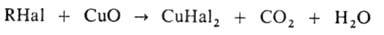 Анализируемую пробу наносят на конец предварительно прокаленной медной проволоки (или в смеси с СиО на платиновый шпатель) и нагревают в несветящемся пламени горелки Бунзена. При наличии в пробе галогенов образующиеся СиНа12 восстанавливаются до CuHal, к-рые, испаряясь, окрашивают пламя: CuCl и CuBr - в сине-зеленый цвет, CuI - в зеленый. Фторорг. соед. не окрашивают пламя, т.к. CuF нелетуч. В зависимости от содержания галогенов окрашивание исчезает мгновенно или наблюдается в течение 1-2 с. Предел обнаружения галогенсодержащего соед. менее 0,1 мкг. Р-ция неизбирательна; мешают нитрилы, мочевина, тиомочевина, нек-рые производные пиридина, карбоновые к-ты, ацетилацетон и др. При наличии щелочных и щел.-зем. металлов пламя рассматривают через синий светофильтр. Способ предложен Ф. Ф. Бейльштейном в 1872. Разработаны модификации Бейльштейна пробы для анализа газообразных и летучих в-в.
