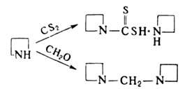АЗЕТИДИН (триметиленимин), мол. м. 57,11; бесцв. жидкость с запахом аммиака; т. кип. 62°С/730мм рт. ст.; d420 0,8436; n20D 1,4229; смешивается с водой и спиртами в любых соотношениях. Азетидин - сильное основание, при 25 °С рКа 11,29. Алкилируется, ацилируется и нитрозируется по атому N. Реагирует с сероуглеродом и формальдегидом: