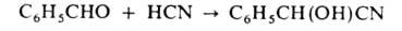 — 3540 кДж/молъ; раств. в этаноле, эфире и других орг. р-рителях, р-римость в воде 0,3%. Образует азеотропные смеси с о-крезолом (т. кип. 192°С;. 23% бензальдегида), бензилхлоридом (177,9°С; 54%), фенолом (185,6°С; 46%) и др. Бензальдегид быстро окисляется на воздухе до бензойной к-ты, подобно алифатич. альдегидам присоединяет по карбонильной группе HCN, NaHSO3 и др., напр.: