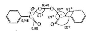 5,33*10-30 Кл*м; не раств. в диэтиленгликоле, кремнийорг. жидкостях, плохо раств. в керосине, петролейном эфире, раств. в простых и сложных эфирах, винилхлориде; р-римость (в %): в ацетоне - 15,7; метилэтилкетоне - 16,0; бензоле - 15,8; стироле - 12,5; метилметакрилате - 12,7; этаноле - 1,2. Структура молекулы приведена ниже (длины связей -в нм):