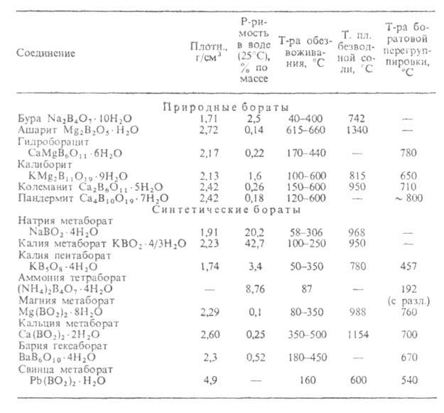 Известно ок. 100 природных боратов, являющихся в осн. солями Na, Mg, Ca, Fe; важнейшие из них приведены в таблице.