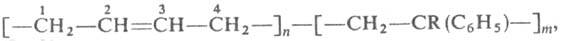 метилстирольных) звеньев в макромолекуле бутадиен-стирольных каучуков различных типов составляет 8-45%. В макромолекулах наиб. распространенных эмульсионных сополимеров, содержащих 23-25% стирольных звеньев, 60-70% звеньев бутадиена присоединены в положениях 1,4-транс, 12-20% - в положениях 1,4-цис и 15-18% - в положениях 1,2. В макромолекулах таких же каучуков, синтезированных в р-ре, содержание бутадиеновых звеньев 1,4-транс, 1,4-цис и 1,2 составляет соотв. > 40, 35-40 и ок. 25%. Вследствие нерегулярности строения бутадиен-стирольные каучуки не кристаллизуются.