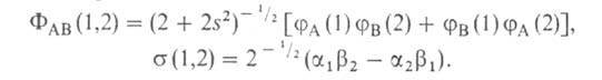 (1,2), антисимметричной относительно такой перестановки и описывающей систему двух электронов с противоположными спинами; цифры 1 и 2 в этих обозначениях указывают пространств. координаты или спиновые переменные первого и второго электронов либо те и другие одновременно. Следовательно,