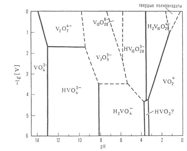 Диаграмма состояния ванадатов(V) в водном р-ре. [V]-концентрация иона V5+ . Пунктирными линиями обозначены приблизительные границы областей существования ванадат-ионов.