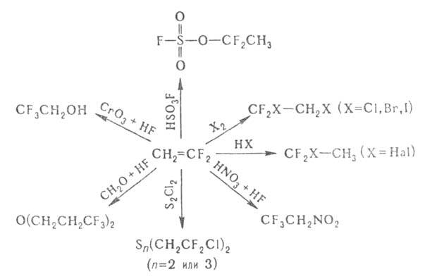 Винилиденфторид легко реагирует с электроф. соединениями, напр.: