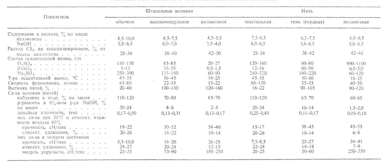 Формование волокон. Вискозные волокна формуют по мокрому способу через фильеры с диаметром отверстий 40-100 мкм. Осадительная ванна - водный р-р, содержащий H2SO4, ZnSO4 и Na2SO4 (см. табл.). При формовании штапельного волокна число отверстий в фильере составляет 10000-120000, текстильных и техн. нитей - соотв. 12-100 и 720-2200. Струи, выходящие из фильеры, осаждаются (коагулируют) вследствие нейтрализации щелочи, образования цинк - ксантогенатных связей и десольватирующего действия электролитов, особенно Na2SO4. Введение в вискозу и (или) в осадительную ванну модификаторов, напр. полиэтиленоксида, способствует получению волокон однородной структуры (в поперечном срезе волокон, полученных без модификатора, м. б. выделены оболочка и ядро). Свежесформованные вискозные волокна представляют собой гель гидратцеллюлозы, содержащий до 80% воды.