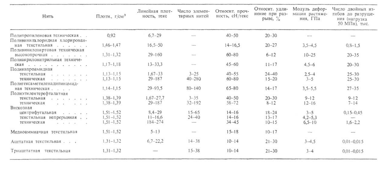 В пром-сти волокна химические вырабатывают в виде: 1) штапельных (резаных) волокон дл. 35-120 мм; 2) жгутов и жгутиков (линейная плотность соотв. 30-80 и 2-10 г/м); 3) комплексных нитей (состоят из многих тонких элементарных нитей; в зависимости от линейной плотности и мех. св-в подразделяются на текстильные и технические); 4) мононитей (диам. 0,03-1,5 мм). Свойства волокон химических и нитей приведены в таблицах 1-4.