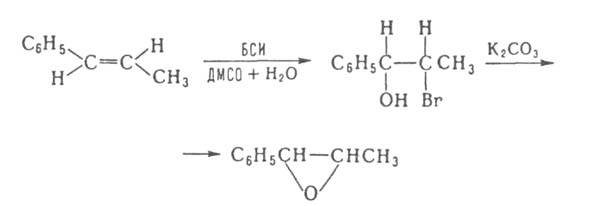 дикетонов. N-Бромсукцинимид (БСИ) используют для получения эпоксидов из олефинов; напр., транс-1-фенил-1-пропен превращ. в эритро-2-бром-1-фенилпропанол (выход 92%) и далее - в эпоксид по схеме: