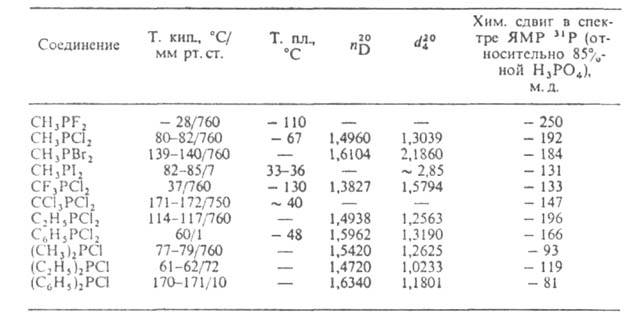 Свойства. Большинство галогенфосфинов-жидкости (табл. 2) с характерным неприятным запахом; хорошо раств. в орг. р-рителях. Диапазон хим. сдвигов в спектре ЯМР 31Р относительно 85%-ной Н3РО4 от 0 до 250 м.д.