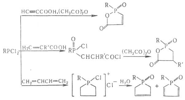 С ненасыщ. карбоновыми к-тами или диенами галогенфосфины дают фосфинаты и фосфиноксиды, в т.ч. циклич. структуры, напр.: