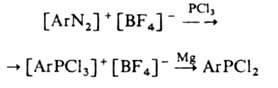 или взаимод. галогенидов трехвалентного Р с тетрафторборатами арилдиазония, напр.: