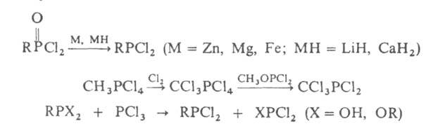 Получение и применение. наиб. разработаны методы синтеза алкил(арил)дихлорфосфинов и перфторалкилиодфосфинов. Метилдихлорфосфин получают с использованием алюминийорг. соед., напр.: