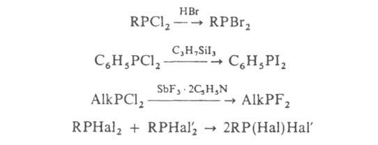 Галогенфосфины можно синтезировать также восстановлением галогенидов четырех- или пятикоординац. Р или с использованием р-ций замещения к.-л. группы на атом галогена, напр.: