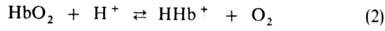 вносит значит. вклад в поддержание постоянного значения рН крови и освобождение О2 в тканях соотв. уровню обмена в-в [увеличение концентрации СО2 сдвигает равновесие р-ций (1) и (2) вправо]. В легких, где рСО2 составляет 40 мм рт. ст., процессы, описываемые р-циями (1) и (2), идут в обратном направлении, в результате чего СО2, находящийся в растворенном и связанном с гемоглобином состоянии, освобождается, гемоглобин оксигенируется и дыхат. цикл завершается.