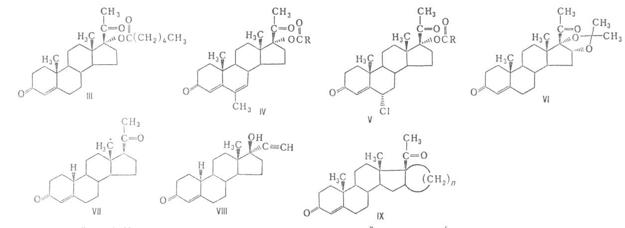 Среди синтетич. стероидов найдены в-ва, превосходящие по своей активности природные и, в отличие от прогестерона, активные при оральном введении. наиб. известны соед. следующих четырех типов: производные прогестерона, содержащие заместители в положениях 6,16,17 [напр., делалутин (III), мегестролацетат (IV, R = СН3), хлормадинонацетат (V; R = СН3), олгестон ацетонид (VI) и его аналоги с атомом N или S вместо кислородного], производные 19-норпрогестерона (VII), эстрана [напр., норэтиндрон (VIII)] и прегна-В'-пентараны (IX; и = = 1-5). У большинства 20-кетопрегнанов вращение ацетильной группы в положении 17 заторможено и преимущественная конформация имеет торсионный угол С(16)-С(17)--С(20)-О(20) от 10 до 40°.