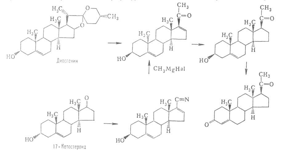 Пром. синтез прогестерона осуществляется из диосгенина (вместо него используют также соласодин) или из 17-кетостероидов (см. ур-ние р-ции). Гестагены применяют при нарушениях овариально-менструального цикла, аменорее, функциональных кровотечениях, для предупреждения выкидышей, а также в качестве противозачаточных ср-в (обычно в комбинации с эстрогенами).