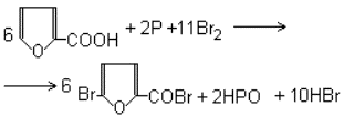 Реакцию проводят в двухлитровой круглодонной колбе, снабженной мешалкой с ртутным затвором, обратным холодильником и капельной воронкой. Для поглощения выделяющегося при реакции бромистого водорода, верхний конец холодильника соединен со склянкой Тищенко, содержащей раствор щелочи. В колбу помещают 112 г (1 моль) фуран-2-карбоновой кислоты с температурой плавления 128-132 градуса, 10 г сухого красного фосфора и 800 мл хлороформа.