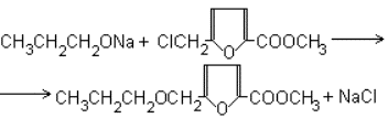 После полного растворения натрия вставляют в один из тубусов капельную воронку, пускают в ход мешалку и в продолжение 1-1,5 часов по каплям приливают 50 г (0,28 моля) свежеперегнанного метилового эфира 5-хлорметилфуран-2-карбоновой кислоты с температурой кипения 114-116 градусов/3 мм, приливание эфира сопровождается обильным выделением хлористого натрия. После окончания прибавления реакционную смесь кипятят на масляной бане (температура бани 120-130 градусов) в течение 8 часов, а затем обратный холодильник заменяют нисходящим и продолжая перемешивание отгоняют большую часть пропилового спирта. К охладившейся до комнатной температуры реакционной массе приливают 150 мл воды и отделяют выделившийся маслянистый слой. Водный слой экстрагируют тремя порциями эфира по 50 мл, которые присоединяют к основному продукту (примечание 1). Эфирный раствор высушивают над прокаленным сернокислым натрием, отгоняют растворитель и остаток перегоняют в вакууме, собирая вещество, кипящее при 146-148 градусов/5 мм.