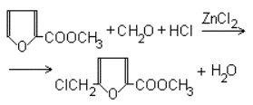 Метиловый эфир 5-хлорметилфуран-2-карбоновой кислоты был получен хлорметилированием метилового эфира пирослизевой кислоты в дихлорметановом растворе параформальдегидом и хлористым водородом в присутсвии хлорида цинка1. Была показана возможность замены растворителя дихлорметана хлороформом2, а также применения вместо хлористого цинка фосфорной кислоты, хлористого алюминия, или смеси гексагидрата хлорного олова с безнодным сернокислым натрием3.