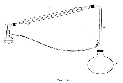 На расстоянии 15 см от нижнего конца к трубке Б припаян изогнутый книзу боковой отросток В. Изогнутый верхний конец трубки Б соединен с наклонным холодильником. К концу холодильника присоединен длинный аллонж с открытым боковым отростком. Конец аллонжа доходит до дна перегонной колбы емкостью 250-300 мл, служащей приемником. В приемник помещают 80-100 мл перегнанного хлороформа. Отводная трубка перегонной колбы, которая должна быть расположена на несколько сантиметров выше отростка В, соединена с этим отростком каучуковой трубкой, через которую при перегонке фурфурола водный слой должен стекать обратно в колбу А. Гидравлический затвор, образующийся в каучуковой трубке ниже отростка препятствует прохождению паров из колбы А в приемник через каучуковую трубку.