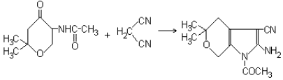 В круглодонную колбу емкостью 200 мл, снабженную водоотделителем с обратным холодильником, помещают 18,5 г (0,1 моля) 5-ацетамидо-2,2-диметилтетрагидропиран-4-она (см. “Синтезы гетероциклических соединений”, вып. 15, с.11), 6,6 г (0,1 моля) динитрила малоновой кислоты, 2 мл диэтиламина, 1 мл ледяной уксусной кислоты и 100 мл абсолютного бензола. Смесь кипятят до прекращения выделения воды (примерно 1-1,5 часа) (прим.). После охлаждения выпавшие кристаллы отфильтровывают, промывают 30 мл бензола и сушат на воздухе. Перекристаллизовывают из 100 мл этилового спирта. Выход 19,1-20,0 г или 81,8-85,7% теоретического количества; т. пл. 180-181°.