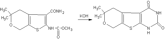 6,6-Диметил-2,4-диоксо-5,6-дигидро-8Н-пирано/4’,3’:4,5/-тиено/2,3-d/пиримидин. C11H12N2O3S, мол. вес 252,23 – белые кристаллы, растворимые в пиридине, диметилсульфоксиде и нерастворимые в воде, этиловом спирте, эфире, бензоле.
