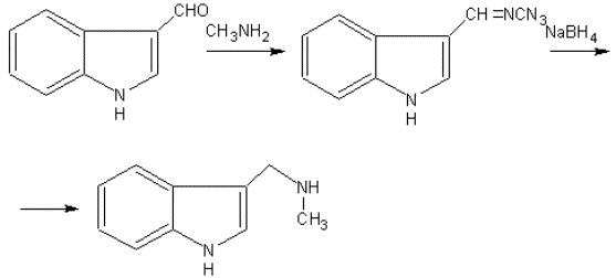 3-Метилиминометилиндол. В круглодонную колбу емкостью 250 мл помещают 10,2 г (0,07 моля) индол-3-альдегида (см. “Синтезы гетероциклических соединений”, вып. 4, с.72) и 108 мл (1,05 моля) 30%-ного водного раствора метиламина (прим. 1). Колбу закрывают пробкой и оставляют в течение 24 ч при комнатной температуре. Выпавшие кристаллы отфильтровывают, промывают водой и сушат в эксикаторе над серной кислотой. Высушенный продукт перекристаллизовывают из 50 мл абсолютного бензола. Выход 8,8-9,2 г (80,4%-83,5%), т. пл. 119-121 (с разложением) (прим. 2).