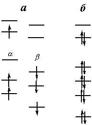 Pис. 3.1. Заполнение МО электронами при расчете волновых функций возбужденных состояний. а — неограниченный метод Хартри—Фока; б — полуэлектронный метод Дьюара