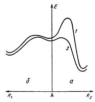 Рис. 1.3. Влияние заместителя на направление реакции образования 4,5-дигидрофуранов (а) и формилциклопропанов (б). А — исходный интермедиат; R1 и R2 — координаты реакций; 1 — R2=H или CH3; 2 — R2 = СНО.