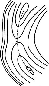 Типичный вид простейшей двумерной ППЭ показан на рис. 1.5. Здесь минимумы соответствуют исходным реагентам и конечным продуктам реакции, а седловая точка - переходному состоянию. Минимумы на рисунке соединены пунктирной линией, которая проходит по дну долины на ППЭ через седловую точку. Эта линия показывает путь реакции в двумерном (в общем случае многомерном) пространстве или траекторию движения реагентов в ходе реакции.