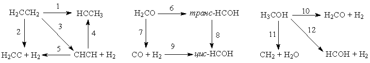 Для реакций, изображенных на схемах I - III, расчеты с оптимизацией геометрии в приближении Хартри-Фока проведены в базисе 6-31ГФ*, для реакций, изображенных на схемах IV и V, - в базисе 3-21ГФ или 4-31ГФ. Электронная корреляция учитывалась только при вычислении энергии активации. Эти расчеты проведены по теории возмущений Мёллера-Плезетта с точностью до четвертого порядка включительно или в приближении связанных электронных пар.