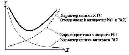 На рисунке видно, что рабочие характеристики аппаратов, образующих ХТС, имеют монотонный характер без экстремумов, однако рабочая характеристика ХТС в значительной степени отличается от характеристик ее элементов.