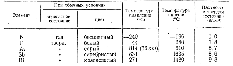 В свободном состоянии элементы подгруппы мышьяка имеют металлический вид и довольно хорошо проводят тепло и электричество. Однако они очень хрупки и легко могут быть измельчены в порошок. Важнейшие их– константы (наряду с соответствующими данными для азота и фосфора) сопоставлены ниже: