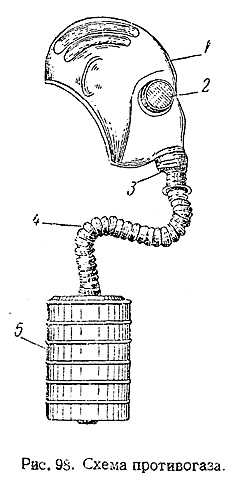 1) На рие. 98 показан один из типов противогаза: 1 – резиновый шлем, надевающийся на голову; 2 – очки; 3 – выдыхательный клапан; 4 – гибкая соединительная труба из покрытой трикотажем резины; 5 – поглотительная коробка (находящаяся во время пользования противогазом в особой сумке). Кроме угля, в состав поглотителя входят некоторые добавки, химически связывающие отравляющие вещества, а также специальная прокладка, служащая для задерживания не поглощаемых углем твердых частиц ядовитых дымов.