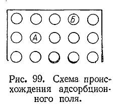 Происхождение адсорбционной способности можно выяснить на основе рис. 99. У любого твердого тела отдельные его частицы (атомы, молекулы или ионы) расположены в известном порядке. При этом частица внутри тела находится в иных условиях, чем расположенная на его поверхности. Действительно, частица А окружена другими такими же частицами равномерно со всех сторон.