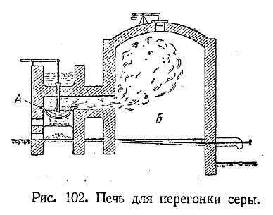 Получаемая из природных месторождений сера почти всегда родержит примеси. Для очистки ее подвергают перегонке в специальных печах (рис. 102). Пар серы, нагреваемый в чаше А, попадая в камеру Б, быстро охлаждается и сера оседает на стенках в виде мельчайших пылинок («серного цвета»). Если камера Б нагрета выше 120 °С, то получается жидкая сера, которая затем нацело затвердевает. Такая сплавленная сера обычно и поступает в продажу.