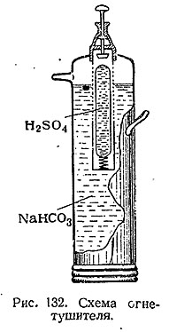 Вообще говоря.дламя может быть потушено одним из следующих путей (или их комбинированием): 1) удалением горючего материала, 2) прекращением доступа кислорода и 3) охлаждением горящего вещества ниже его температуры воспламенения. Огнетушители с NaНСО3 работают по второму и отчасти третьему методам. Схема такого огнетушителя показана на рис. 132. Почти весь его баллон заполнен концентрированным раствором NaНСО3 (с примесью веществ, способствующих образованию пены). В верхней части баллона имеется стеклянная ампула, содержащая серную кислоту. Для приведения огнетушителя в действие его перевертывают вверх дном и разбивают ампулу помещенным в крышке ударником. Кислота вступает в соприкосновение с раствором NaНСО3 , причем тотчас образуется большое количество углекислого газа. Насыщенная им жидкость вытекает сильной струей и покрывает горящее место густой пеной. Последняя охлаждает его (за счет испарения воды), главным же образом изолирует от кислорода воздуха, благодаря чему горение прекращается.