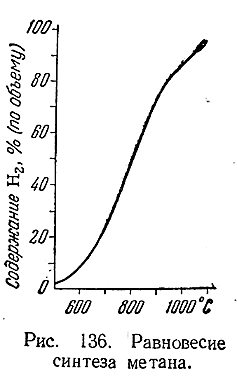 в обычных условиях практически не происходит. При нагревании и в присутствии катализатора (мелко раздробленный Ni) устанавливается равновесие, положение которого сильно зависит от температуры (рис. 136). Помимо этого синтетического пути, метан –может быть получен рядом других методов, исходя из более сложных соединений углерода. В природе он постоянно образуется при разложении органических веществ без доступа воздуха (например, в болотах). Он часто содержится также в природных газах и обычно входит в состав искусственно получаемого светильного газа.