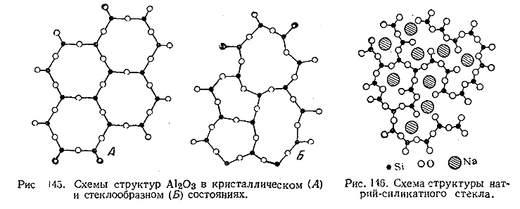 8) Исследования при помощи рентгеновских лучей показали, что стеклообразное состояние вещества (подобно жидкому) отличается от кристаллического неполной упорядоченностью взаимного расположения отдельных элементов пространственной решетки. На рис. 145 приведены схемы структур Al2 O3 в кристаллическом (Л) и стеклообразном (Б) состояниях. Как видно из этих схем, характерные для кристаллической решетки AI2 O3 шестиугольники в стеклообразном состоянии строго не выдержаны, но общий характер расположения частиц все же подобен имеющему место в кристалле.