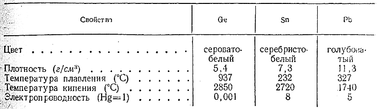 По физическим свойствам Ge, Sn и Рb являются типичными металлами. Некоторые их константы сопоставлены ниже: